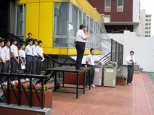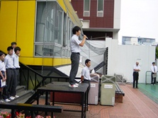 | 校長先生のお話からセレモニーが始まります。 | 続いて生徒会長からの注意事項です。 | ||