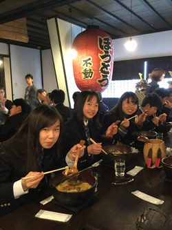 昼食はほうとう。鍋ごと出てきて生徒は驚いていました。