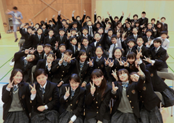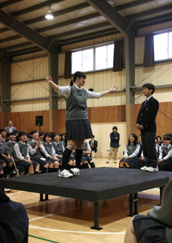 その後は中高合同でシアター形式のワークショップ。劇団音楽座の方の指導により高校生と一緒に舞台に上がるなどして楽しみました。なんと田村校長も舞台に上がるという驚きの展開があり、会場は大いに盛り上がりました。