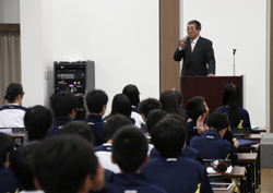 食後の全体会は生徒指導部長からのお話を聞きます。
