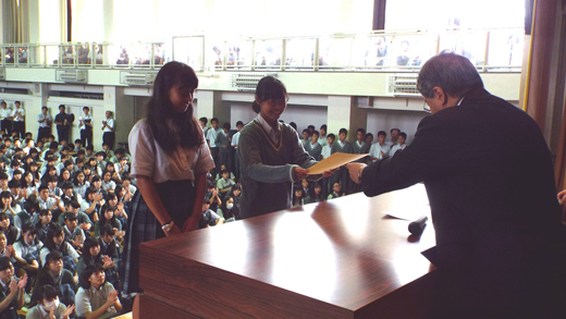 女子ダブルスで目黒区大会で優勝したテニス部員の表彰。