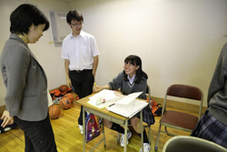 休憩時間。顧問教員と笑顔でお話しします。