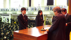 始業式では朝学習で1080点満点中1079点という素晴らしい高得点で同点1位となった高3の2名が表彰されました。また団体の部で城南大会第3位の成績を収めたテニス部の部員が表彰されました。