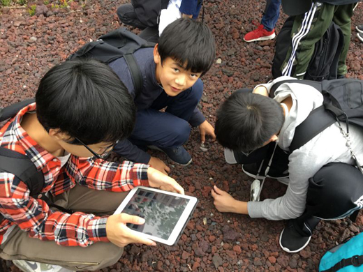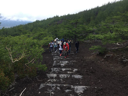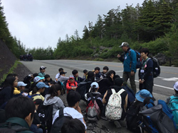 コースは御庭からお中道を通って5合目まで行く約3.5km。各クラスを2班に分け、班ごとに山のガイドさんがついて様々な場所で説明を聞きながら、多くのことを学びました。田村校長も生徒たちと一緒に散策。生徒たちも校長先生を応援しながら、とても楽しそうでした。