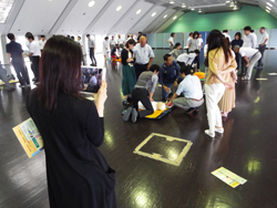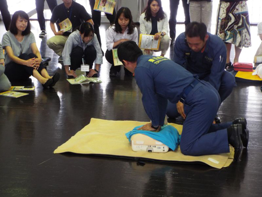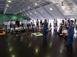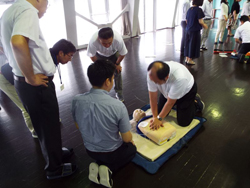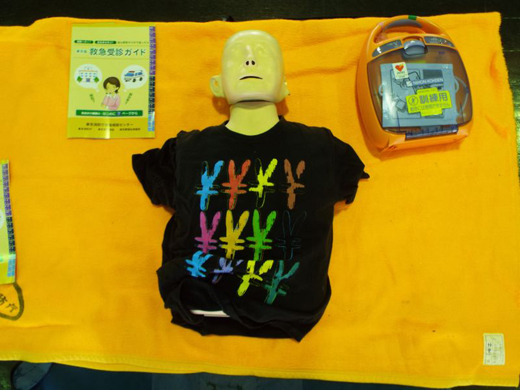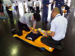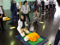 目黒消防署の講師の方々の指導のもと、胸部圧迫(心臓マッサージ)、AEDの商用方法、周りにいる方への指示などを習いました。その後6つの班に分かれて、全員が訓練を行いました。