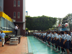 「おかしも」を守りながら、校舎から校庭へと進みます。