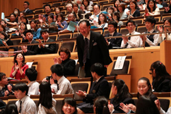 課題曲指揮者賞が発表されて周りから拍手を受ける受賞者。