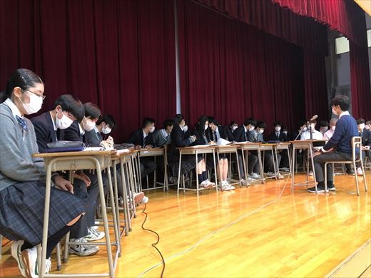 29日の当日、弁護士役、検察役、裁判官役の生徒は舞台に上がり、模擬裁判を行いました。他の生徒たちはその様子を見守りながら、実際の裁判がどのように進められていくのか確認していました。