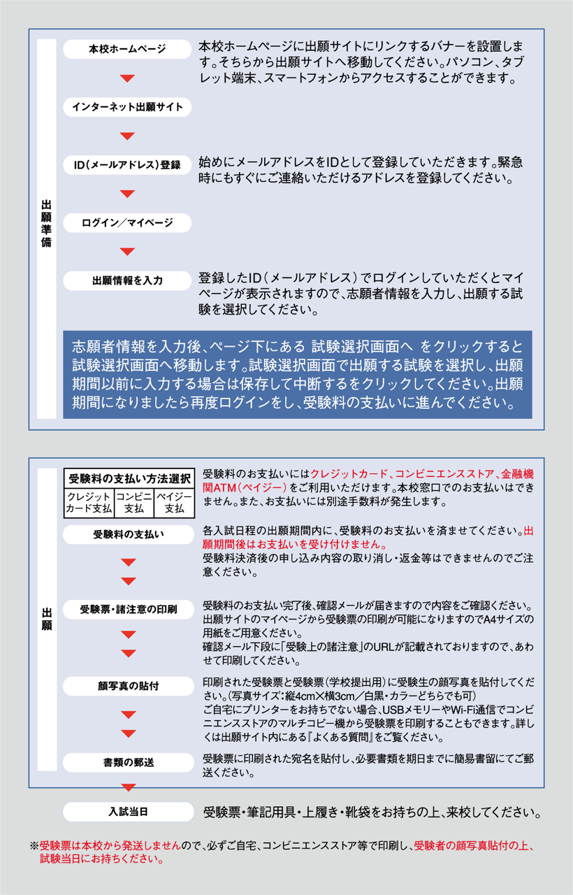 高校入試は全てインターネット出願となります。 出願準備(ID登録・出願情報の入力)は2026年1月8日(木)10:00より行うことができます。 出願(受験料の支払い、受験票の印刷)は、推薦1月15日(木)以降、一般1月25日(日)以降になります。 振込手続き後に受験票を印刷し、本校HPからダウンロードした必要書類などすべて揃えた上、簡易書留にて郵送して下ください。